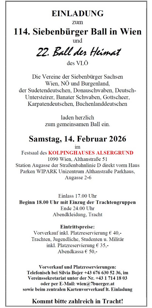 | Verein der Siebenbürger Sachsen in Wien, Niederösterreich und dem Burgenland | Haus der Heimat, Steingasse 25, 1030 Wien | Tel.: +43-1-7141803 bzw. E-Mail: wien@7buerger.at |